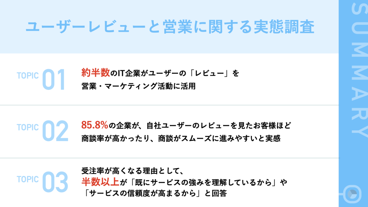 - 85.8%の企業が、自社のユーザーレビューを見たお客様ほど、商談率が高かったり、商談がスムーズに進みやすいと実感