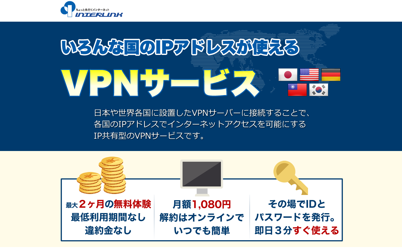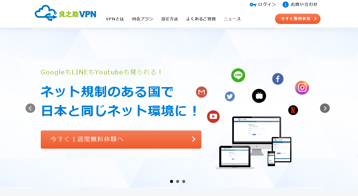 日本のVPNの中で最も知名度が高く、中国での利用も多いIP共有型VPNです。即日3分、解約金や最低利用期間が発生しない手軽さが魅力です。サーバ設置国は日本とアメリカ、ドイツ、台湾、韓国の合計5カ国と海外VPNに比べると少ないですが、規制が厳しい国でのFacebookやYouTubeなどにアクセス可能です。通信帯域保証はありませんが、プロトコルは信頼性の高いOpenVPNやIKEv2にも一部端末で対応しています。海外から日本国内限定の動画やラジオなどを利用したい、一時的にVPNを利用したいなどの場合に向いています。