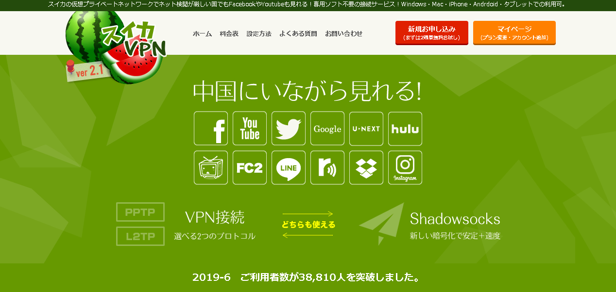 SNSや日本の動画配信サイトに幅広く対応した、暗号化通信を可能にするVPNです。規制が厳しい中国からのアクセスも可能なため、旅行者に多く利用されています。速度保証はなく、接続できるプロトコルはPPTPとL2TPのみと安全性はそこまで高くありませんが、スマホ向けの新接続方式「Shadowsocks」により安定性と速度を実現します。主にスマホで海外からの動画視聴やネットサーフィンをしたい方に向いています。WindowsやAndroidなどの幅広い端末にも対応し、専用ソフトのインストールは不要です。出張や旅行に便利な短期間のプランも充実しています。