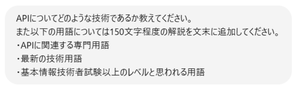 すでに軽く調査済みであっても、リサーチ結果に知らない単語、特に専門用語が出てくる可能性は大いにあります。そのため、プロンプトで「専門用語については必ず150文字以内の簡単な説明を追加してください」と記述しておくと、都度別途で調査をしなくても概要であれば掴むことが可能です。特にChatGPTであれば、ヒストリー機能により過去のチャットも参照されるので、自分の知識レベルに合わせた解説をしてくれる可能性が高まります。
