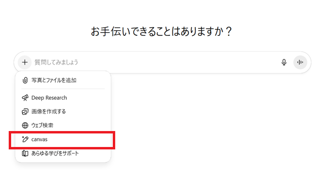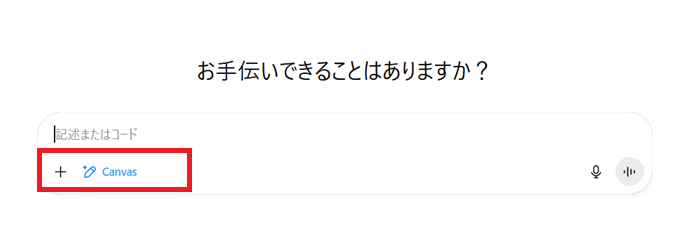 チャット欄左の「+」をクリックし、展開されるメニューから「Canvas」を選択します。