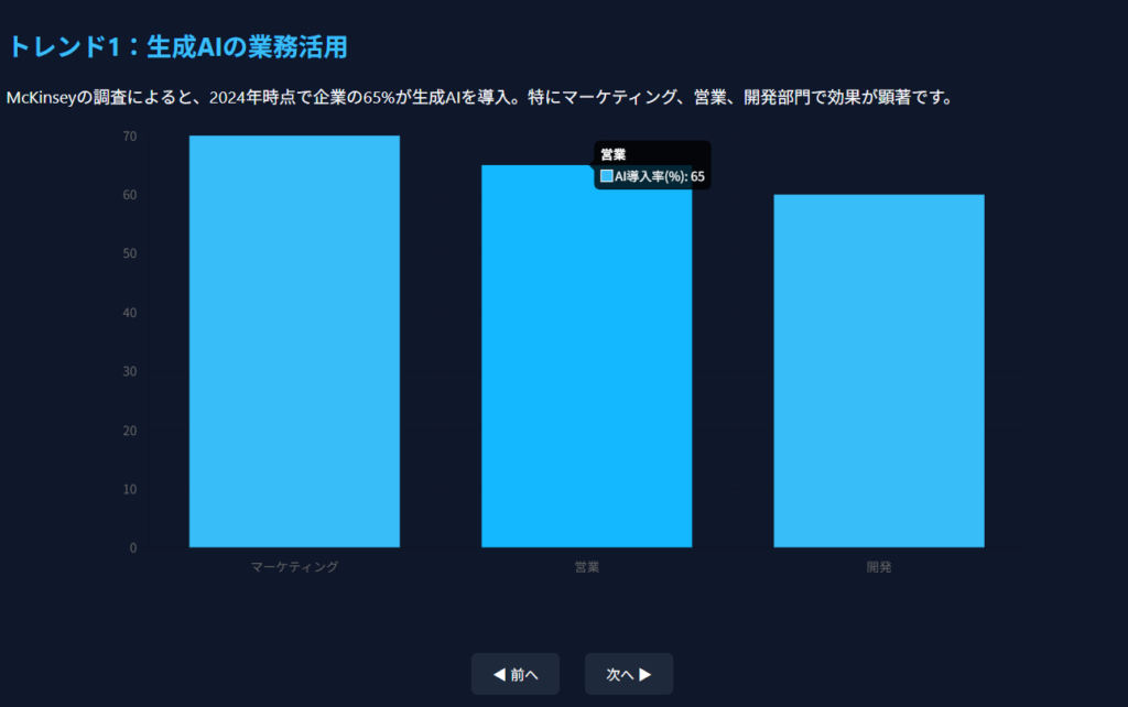 - Canvas:AIに「ページ送り機能付きのスライドを作成して」と指示