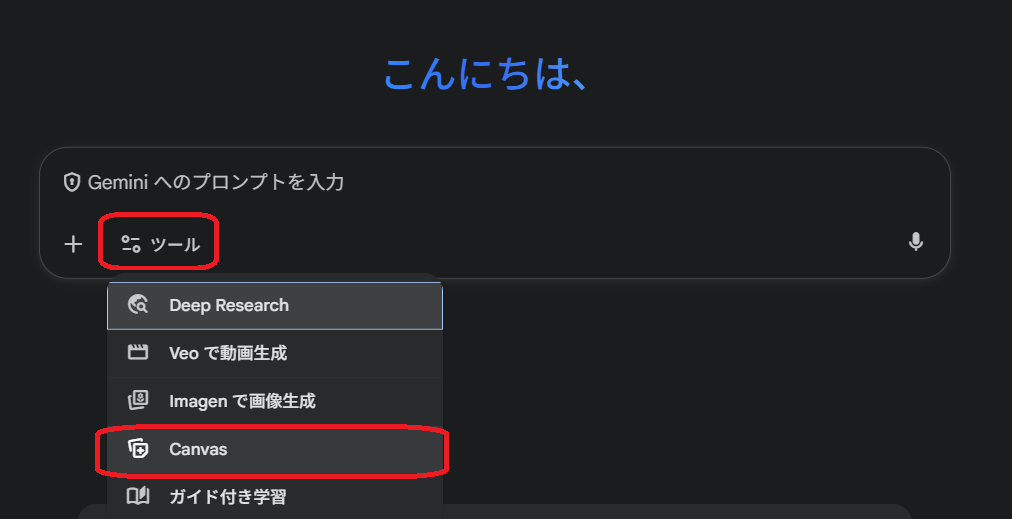 チャット欄の「ツール」をクリックし表示されるメニューから「Canvas」を選択してください。