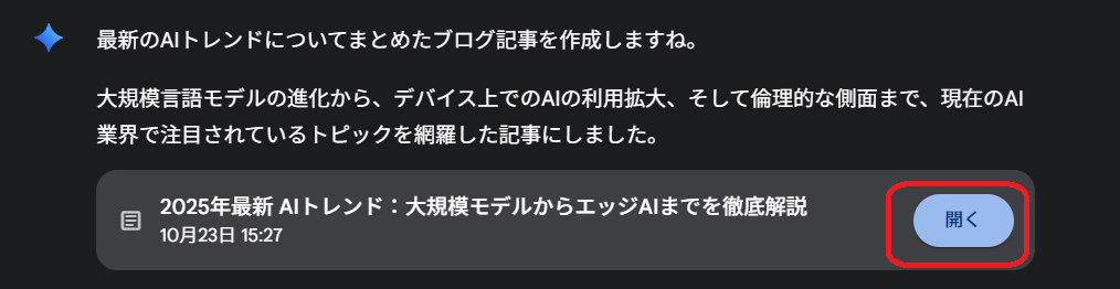 もしも編集画面が表示されない場合、生成物はチャット履歴に薄灰色のブロックで表示されているので、ブロックの「開く」をクリックしてください。