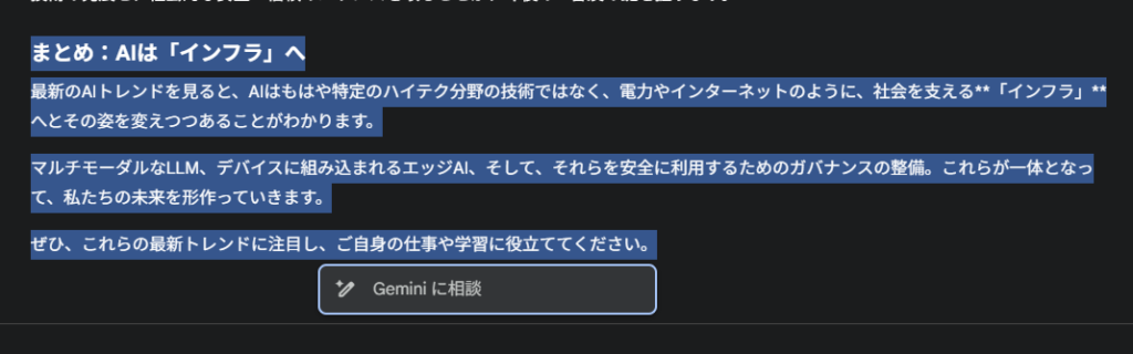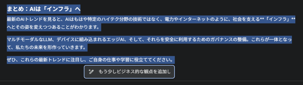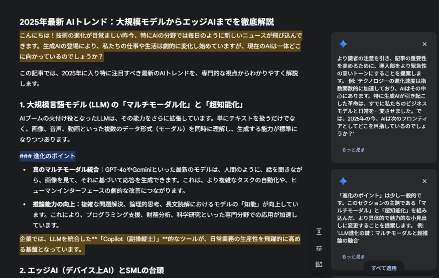 このほかにも、Geminiにはデフォルトで生成物に合わせたワンクリック編集メニューが用意されています。今回はドキュメントなので、