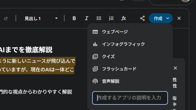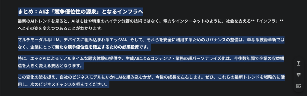 編集画面では、編集したい箇所をドラックで選択すると、編集バーが表示され、自然言語で修正指示が可能な「ChatGPTに質問する」と、成果物の形式に沿った編集メニューが表示されます。今回はドキュメント形式なので、太字、斜体等といった内容が追加で表示されています。