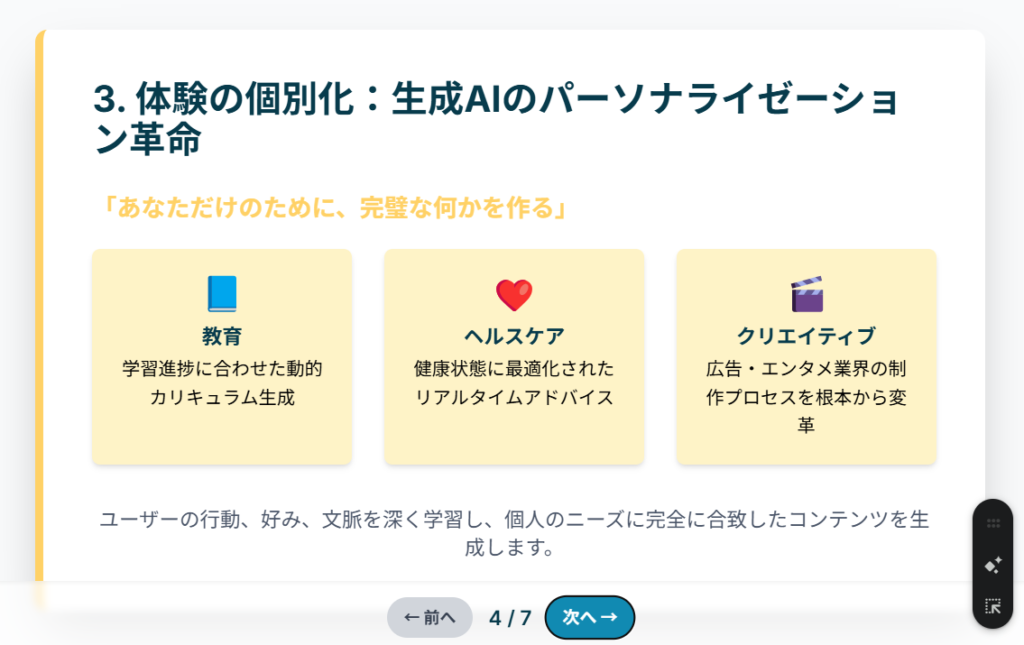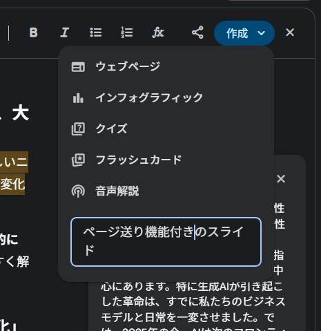 作成方法は先ほど紹介した「④ワンクリック生成」で表示したテキストボックスに「ページ送り機能付きのスライド」と入力してください。このほかにスタイルの指定をしてもよいですし「文字は少なめで視覚表現多め」や「ポップなイメージで」といったような指定も効果的です。