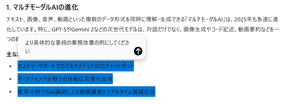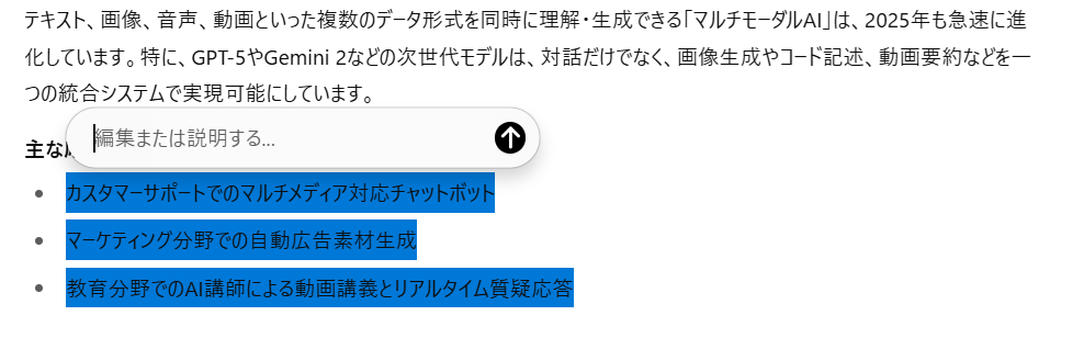 こちらも基本的な操作はChatGPTと同様です。修正したい箇所を選択し、表示されるバルーンに修正したい内容を入力します。