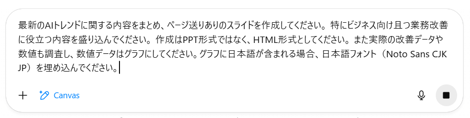 ※ 今回は、調査内容も同一プロンプトで指示していますが、DeepResearchの結果に対して、Canvas機能でスライド生成を指示することも可能です。ただし、DeepResearchとCanvasを同時に実行することはできないため、必ずDR→Canvasというようにタスクを分解して実行してください