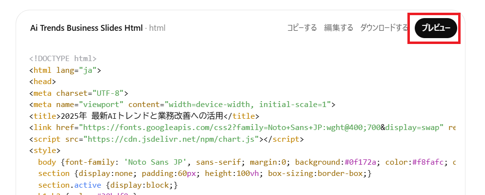 Canvas機能で出力されたブロックには、右上に「コピーする」「編集する」「ダウンロードする」が、コード出力の場合は「コードを実行する」が、HTMLの場合は「プレビュー」等のメニューが表示されます。