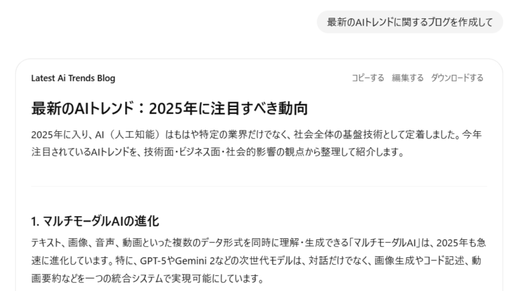 たとえば「最新のAIトレンドに関するブログを作成して」と依頼すると、Canvas機能で成果物がブロック出力されます。