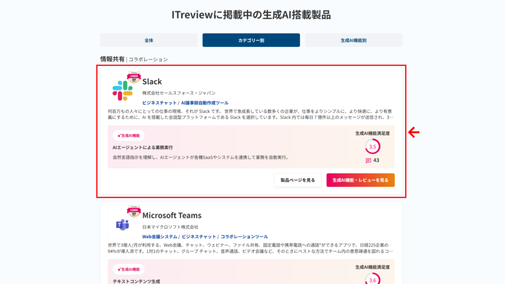 選択したカテゴリーのうち、生成AI機能に関するレビューが多い順に製品が表示されます。