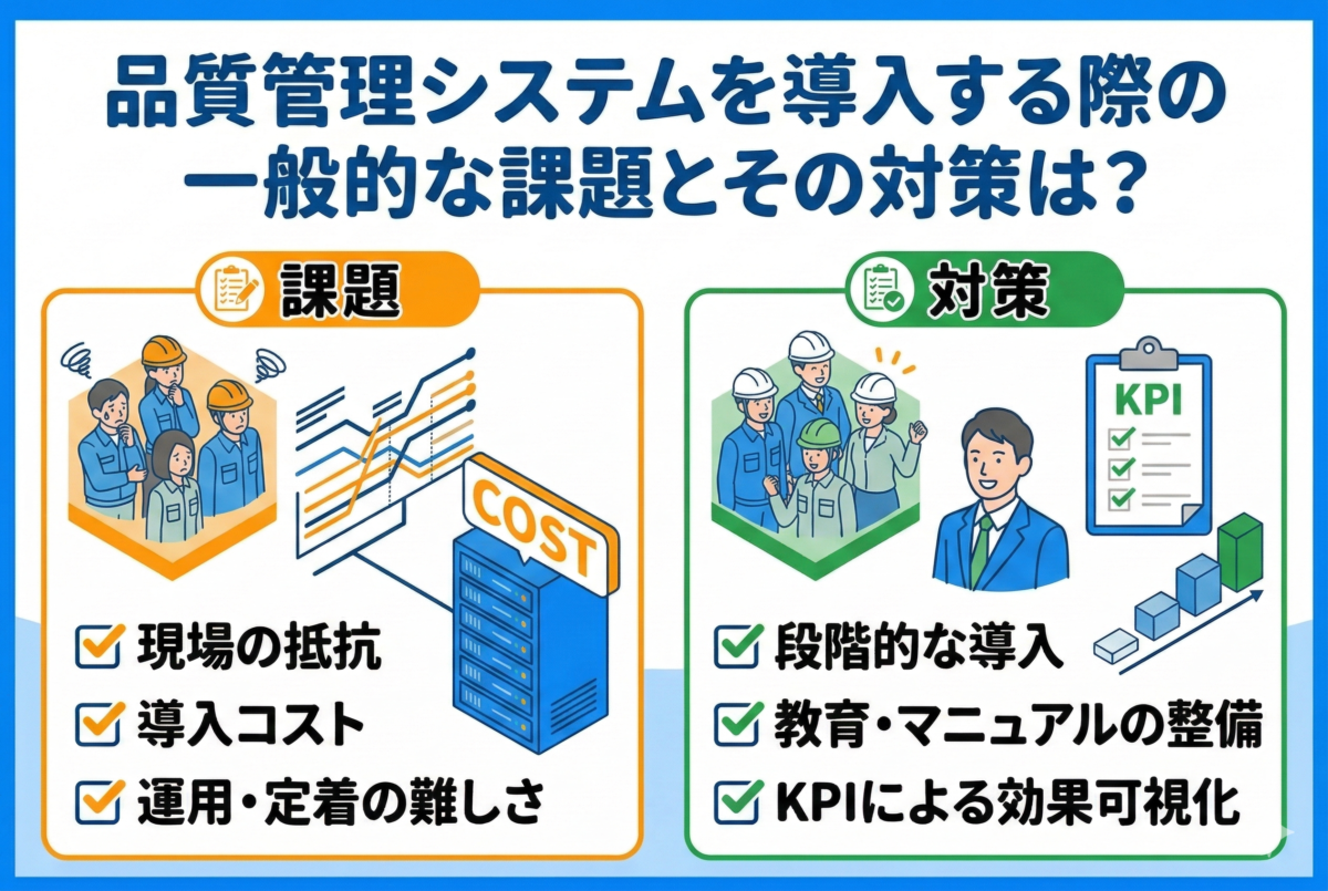 品質管理システムの導入の一般的な課題は、経営層の関与不足・現場とのミスマッチ・文書管理の複雑化・教育不足・内部監査の形骸化・導入目的の不明確さ・コスト負担の7点です。