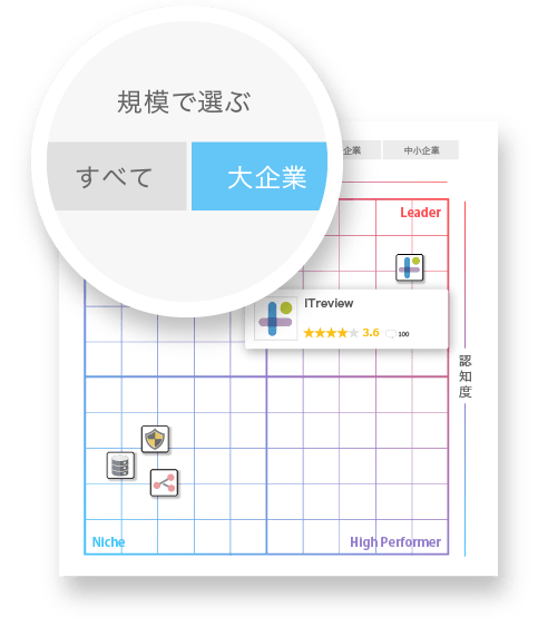 また、大企業ユーザーの評価に絞ったり、中小企業ユーザーの評価に絞ったりと、企業規模毎のGridもチェックできます。