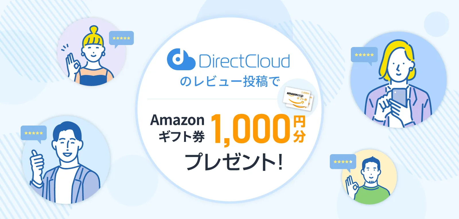 法人向けクラウドストレージ「DirectCloud」をご利用いただき誠にありがとうございます。 今回のキャンペーンでは、 「DirectCloud」を導入して良かった点やお気に入りの機能・気になるポイントなど 製品に関するレビューを投稿いただくと1,000円分のAmazonギフト券をプレゼントさせていただきます。 今後の製品改善やサービス向上のため、ぜひご意見をお聞かせください。 ※こちらのレビュー投稿は匿名での投稿も可能です。 ※キャンペーンコードの記載がない場合対象外となりますのでご注意ください。 ※本キャンペーンは予告なく終了する場合がございますのであらかじめご了承ください。