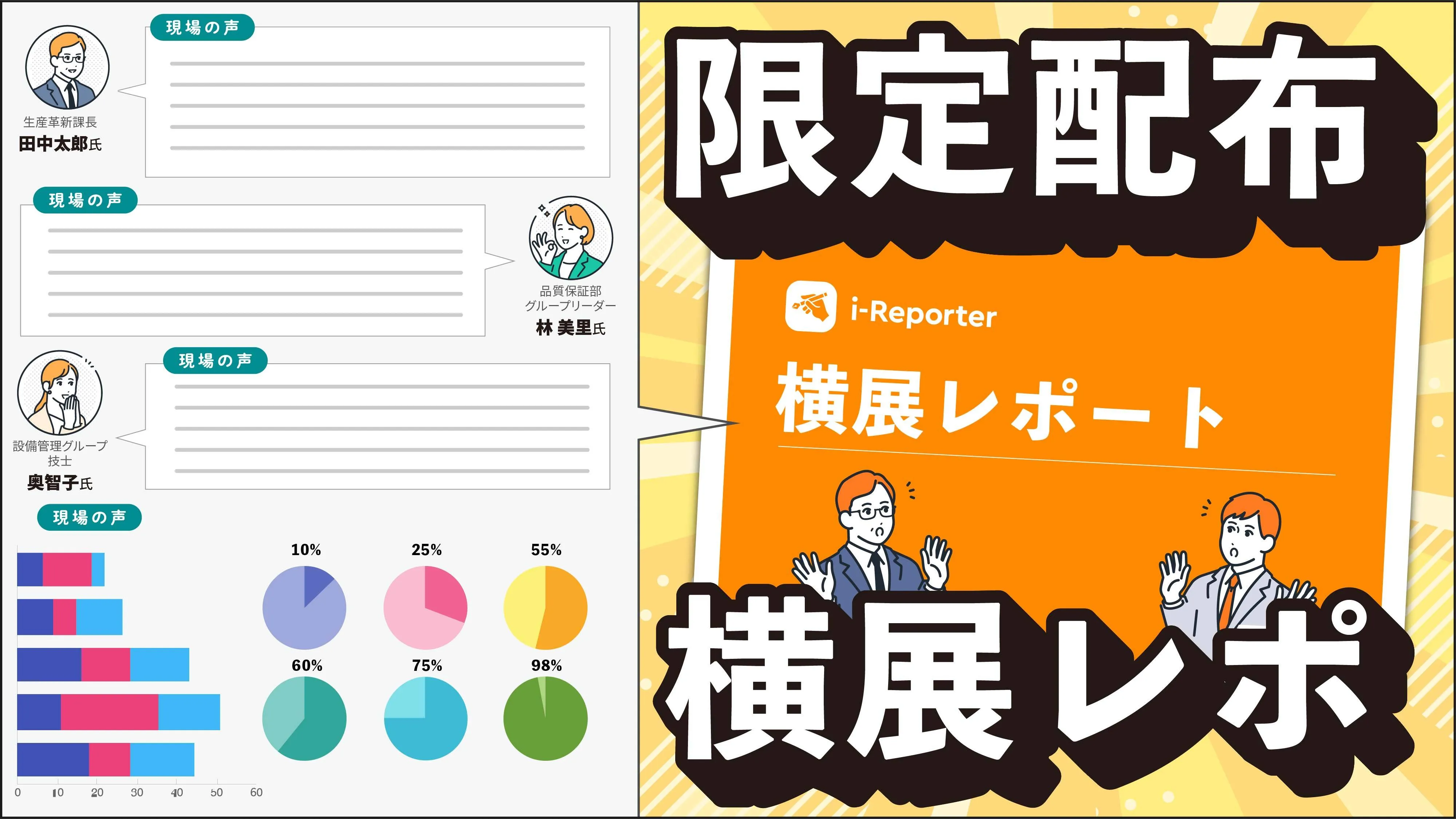 本イベントは皆様に投稿頂いた「i-Reporter」レビューの集計・分析を行い、 「横展レポート」として資料化、配布するキャンペーンです。 ▼横展レポートとは i-Reporterユーザーが具体的にどんな業務、帳票で活用していて、どんな効果を得ることができているかをわかりやすくビジュアライズした資料です。 本レポートを見ていただくことで、自社内や自部門では現在実施できていないカイゼン推進を行うためのヒントとなるだけでなく、他部門のメンバー様へ、重要なカイゼンの一手となる情報を共有頂くことができます。 ▼横展レポートの配布について 横展レポートは、レビュー投稿をいただいたお客様にのみお送りいたします。 加えて、先着順でレビュー返礼として【2,000円分】のAmazonギフト券を贈呈致します。 ※本イベントは過去にレビュー投稿頂いた方も参加可能です。 ※会社名や氏名などは一切公表されません。 ※横転レポートはイベント期間終了後の送付を予定しております。 レビュー投稿時は以下の注意点をご確認ください。 https://x.gd/uxJyK