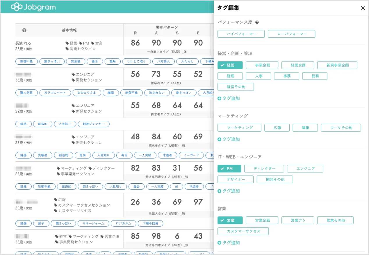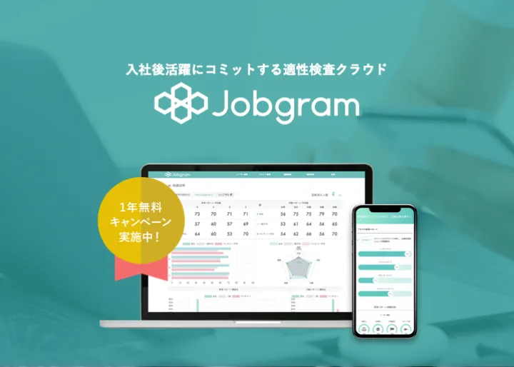 「Jobgram(ジョブグラム)」は、入社後活躍にコミットする適性検査クラウドです。採用フロー全般に性格傾向データの活用を組み込み、定量的な採用基準を設定します。それによって、圧倒的な採用効率化とハイパフォーマー / ローパフォーマーの発見を実現し、採用の失敗を防ぎます。