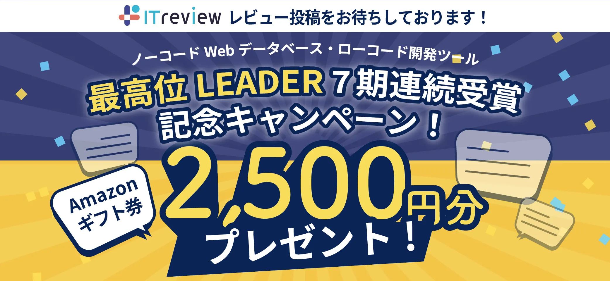 いつもプリザンターをご活用いただきましてありがとうございます! 皆さまのお陰で今期もノーコードWebデータベース・ローコード開発ツールでLEADERを受賞することができました! レビューを投稿し審査が通った方には、先着で2,500円分のAmazonギフト券をプレゼントいたします! プリザンターの使いやすいところ、気に入っているところ、今後期待しているところ、もちろん改善を希望するところなども含めて忌憚のないご意見をいただけましたら幸いです。 レビュー公開後に【Amazon ギフト券 2,500円分】をプレゼントいたします! 是非この機会にお早めにご投稿ください! 皆様のレビュー投稿をお待ちしております!