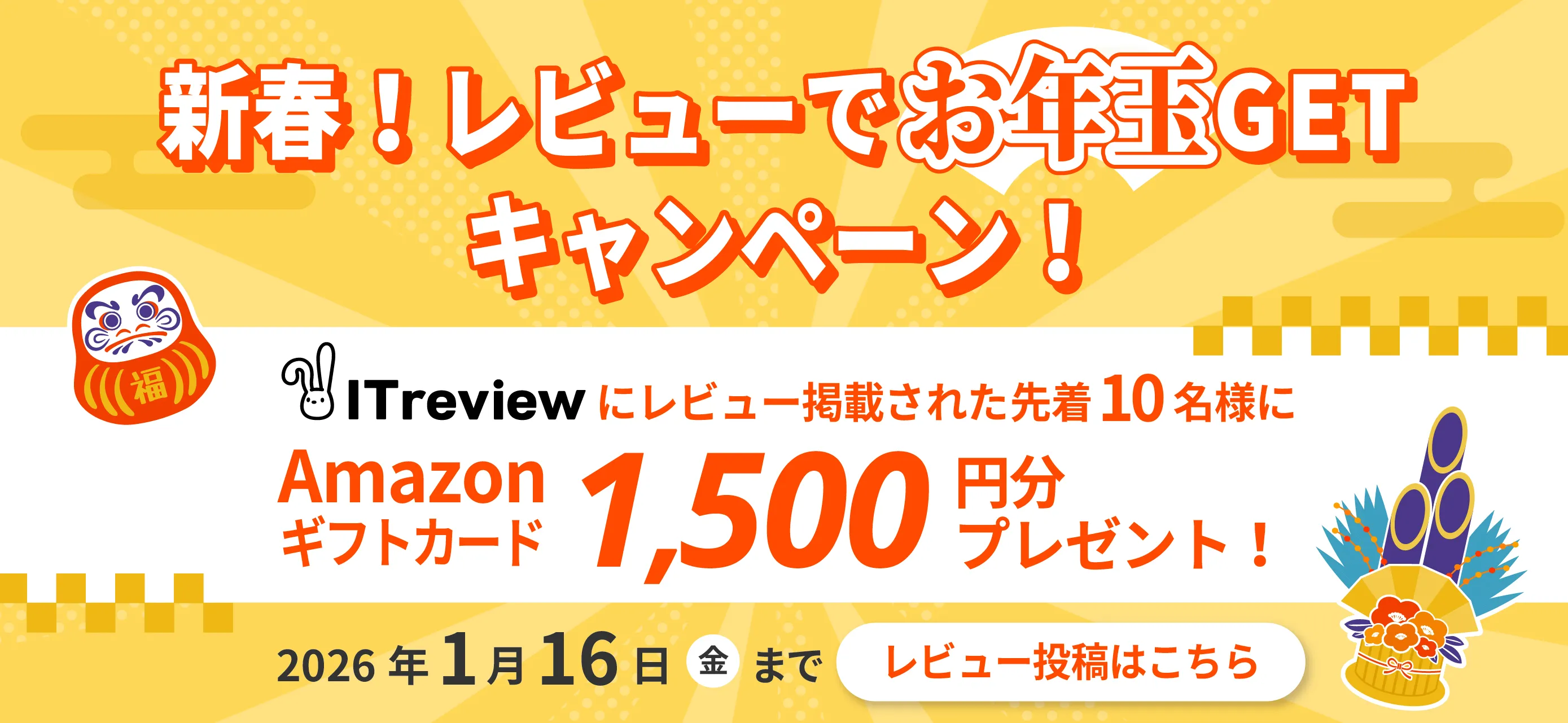 新年あけましておめでとうございます! 日頃より弊社サービスをご利用いただいている皆さまへ感謝を込めて、「お年玉キャンペーン」を開催します! ITレビューにご投稿いただいた方へ、ギフトカードをプレゼント。 ぜひこの機会に、サービスを使ってみて感じた率直なご意見や、便利だった機能、改善してほしいポイントなどをお聞かせください。 開催期間 :2026年1月5日(月)~2026年1月16日(金) プレゼント:Amazonギフトカード1,500円分 皆さまからの声は、今後のサービス向上や新機能開発に役立ててまいります。 新しい一年のスタートに、ぜひご参加ください! あなたの声が、サービスをさらに良くする大きな一歩になります。 ⚠ 注意事項(必須) ・ギフト券はレビュー公開確認後のお渡しとなります。 ・いただいたご要望すべてにお応えできるとは限りません。 ・予告なく期日前に終了する場合があります。