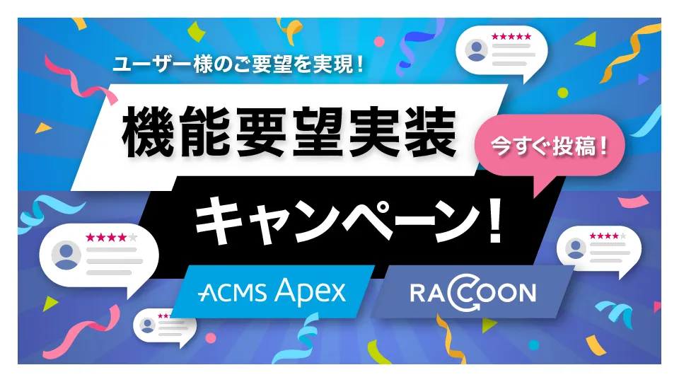 株式会社データ・アプリケーションは、レビューで頂いたご要望を実際にエンタープライズ・データ連携プラットフォーム「ACMS Apex」およびデータ ハンドリング プラットフォーム「RACCOON」の機能として開発するキャンペーンを開催いたします。 ご要望が採用されたお客様には、詳細ヒアリングを実施の上、 ACMS Apex・RACCOONへの機能実装を行います。 また、機能実装の有無に関わらず、レビューをご投稿いただいたお客様には、 御礼としてAmazonギフト券1,000円分をメールにてお送りいたします。 【締切:2025年1月31日(金)18:00まで】 【注意事項】 ※原則として頂いたご要望の数が多いものから採用いたしますが、 実装が難しいご要望の場合は採用を見送らせて頂き、次位のご要望を採用することがございます。 なお、採用したものでも弊社にて開発方針や実現性を総合的に判断し、 現実的な仕様に落とし込みをさせて頂きます。 ※ご要望頂いたお客様へ、要件確認のため弊社からご連絡する場合がございます。 ※機能としてリリースされる時期は対象機能の種類や規模によって異なります。
