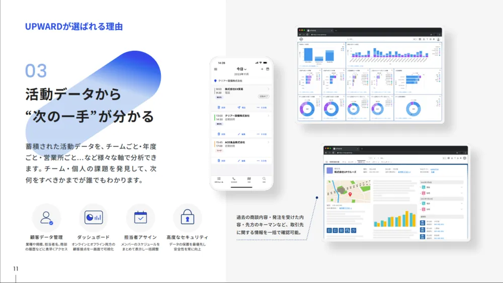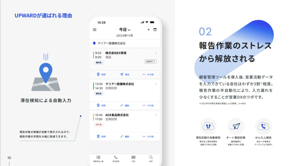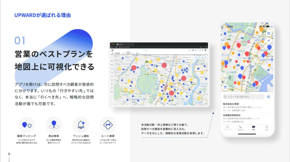 UPWARDは「とにかく現場で使いやすいSFA」という印象です。特に位置情報との連携が優れていて、営業担当が現場でアプリを開くと、近隣の訪問候補が自動で出てくる機能はかなり実用的。訪問先のログも、スマホからそのまま記録できるので、報告忘れや紙メモ→Excel転記のようなムダがなくなりました。営業企画側としても、誰がどこに訪問して何を話したかが時系列で追えるようになったので、マネジメントや戦略立案の素材としても使える情報が増えたと感じています。
